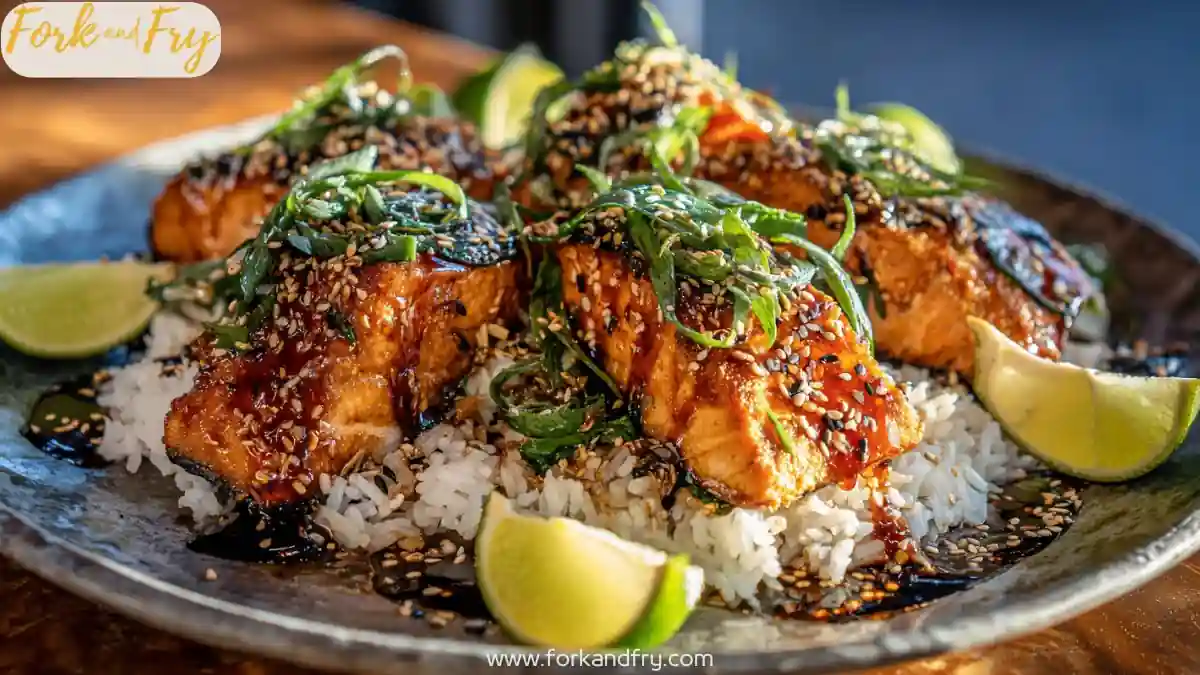 teriyaki-glazed salmon on rice with sesame seeds, scallions, and lime wedges