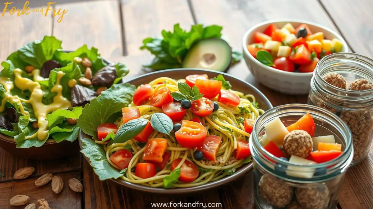 Raw vegan Recipes - A vibrant assortment of raw vegan dishes, including green salad, zucchini noodles, rainbow fruit salad, and energy balls, arranged on a rustic wooden table with natural sunlight.