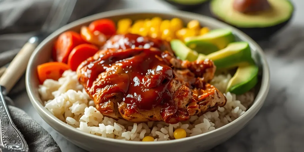 A hearty and flavorful BBQ Chicken Bowl with rice and fresh vegetables, perfect for BBQ lovers.