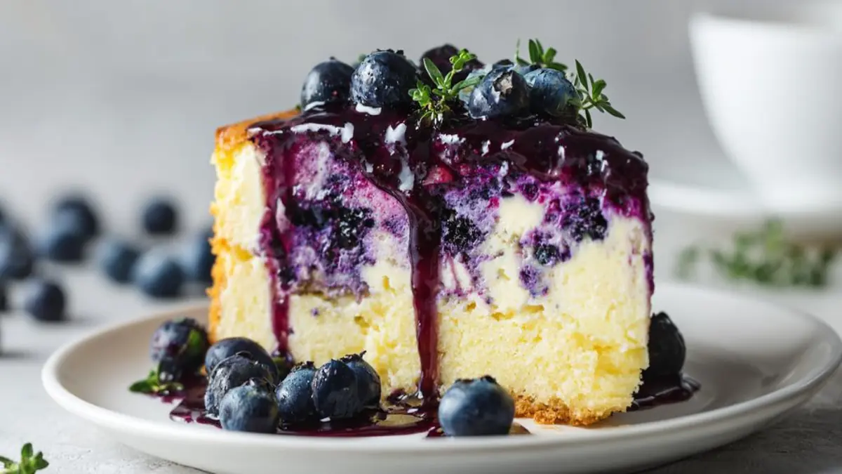A delightful fusion of cheesecake and cake, topped with fresh blueberries, perfect for spring gatherings.