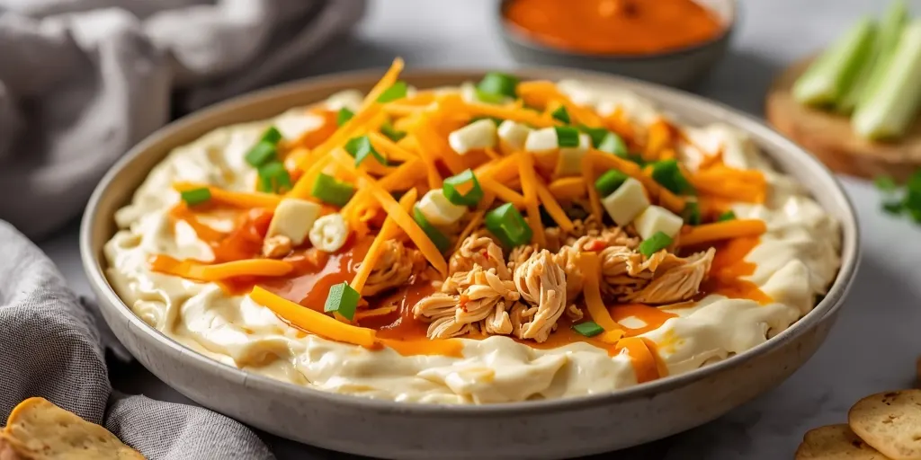 A creamy and spicy buffalo chicken dip with shredded chicken and cheese, perfect for parties and gatherings.