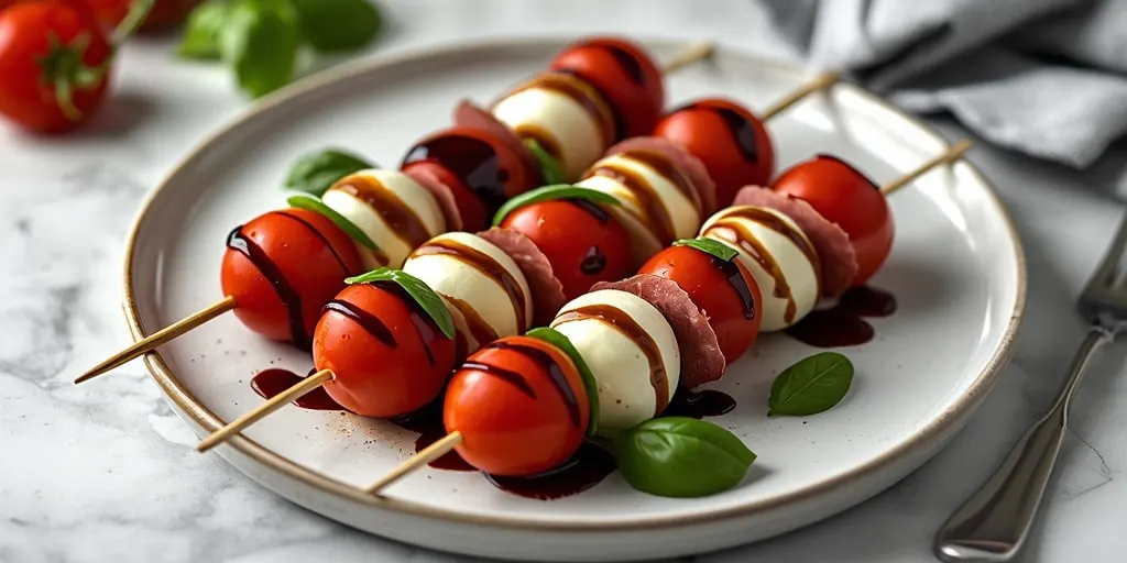 A delightful twist on classic Italian Caprese, these skewers feature fresh mozzarella, cherry tomatoes, basil, and salami, drizzled with a balsamic reduction.