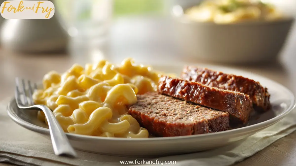 A traditional beef meatloaf served with creamy stovetop macaroni and cheese for a classic comfort food dinner.