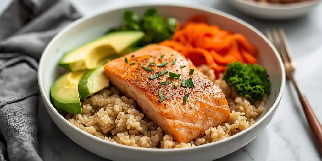 A delicious and healthy clean eating salmon rice bowl with fresh ingredients and vibrant flavors, perfect for a nutritious meal.