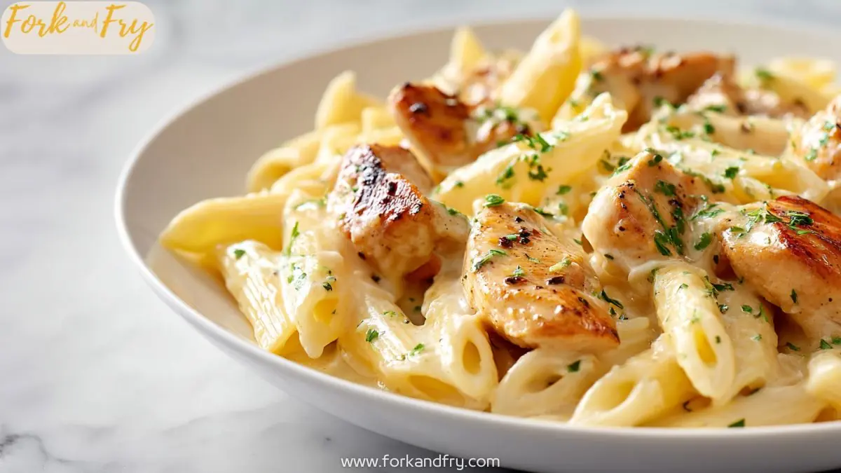 A rich and balanced skillet pasta featuring tender seared chicken, garlic-infused cream sauce, and freshly grated Parmesan. Finished directly in the pan for a silky sauce that clings to every bite.