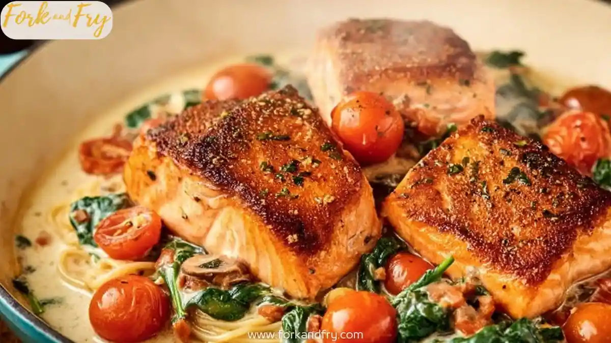 A rich, comforting dish featuring salmon in a creamy sauce with sun-dried tomatoes, spinach, and garlic, embodying vibrant Tuscan flavors.