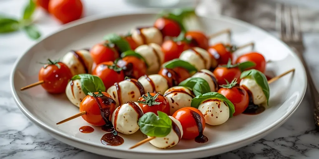 Simple and delicious caprese skewers featuring cherry tomatoes, fresh mozzarella, and basil leaves, drizzled with balsamic glaze for the perfect appetizer.
