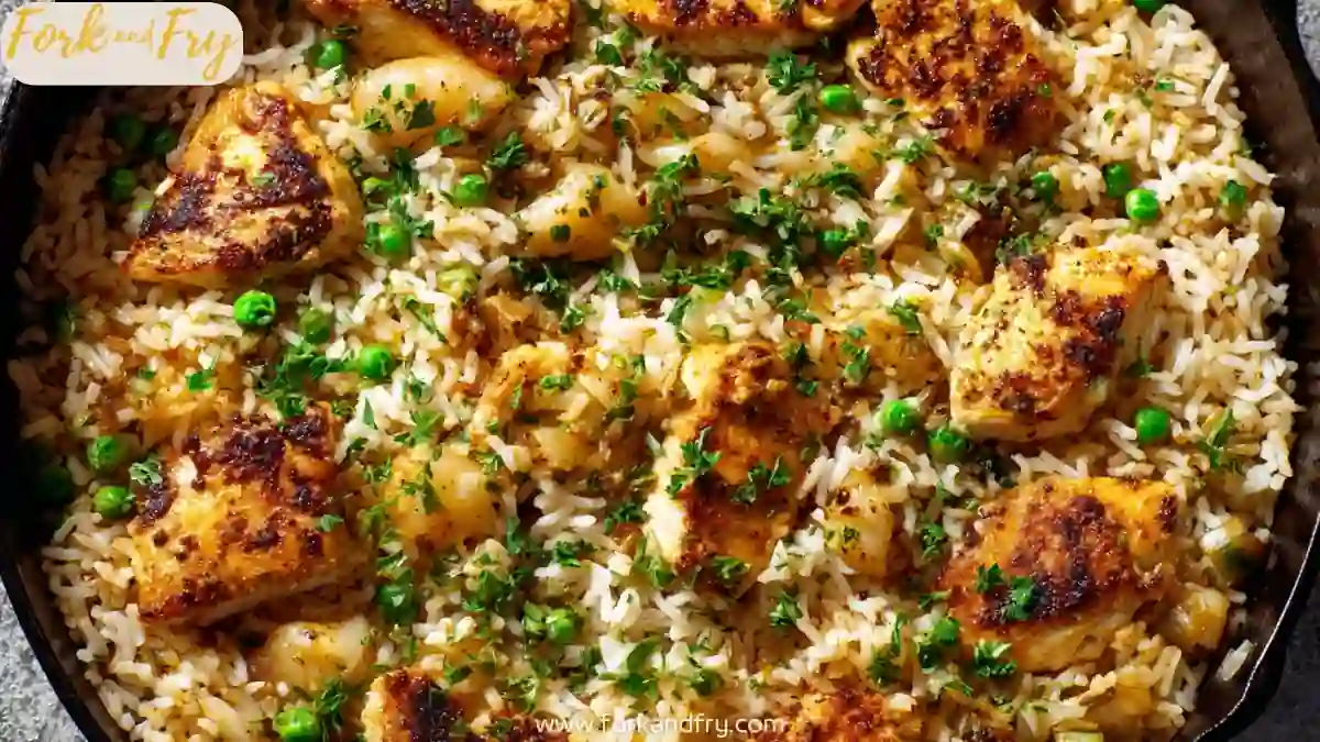A structured one-pan skillet chicken and rice dinner with fluffy long-grain rice and juicy chicken finished together under a tight lid. Built for weeknights with real flavor layering from seared chicken, toasted rice, and savory broth.