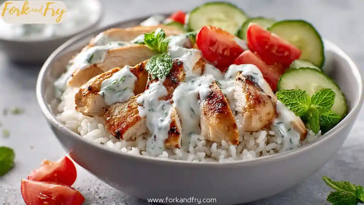 Marinated grilled chicken served over rice with fresh vegetables and creamy tzatziki for a balanced Mediterranean-style bowl.