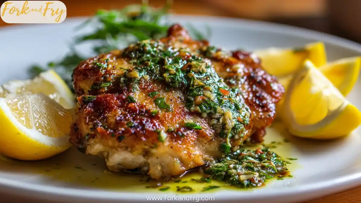 A flavorful grilled chicken dish with zesty Salmoriglio sauce that embodies Mediterranean flavors.