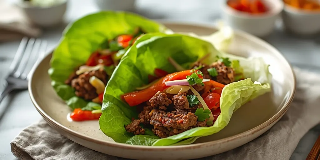 A delightful and healthy beef lettuce wrap dinner that combines savory ground beef with fresh vegetables and herbs, all wrapped in crisp lettuce leaves.