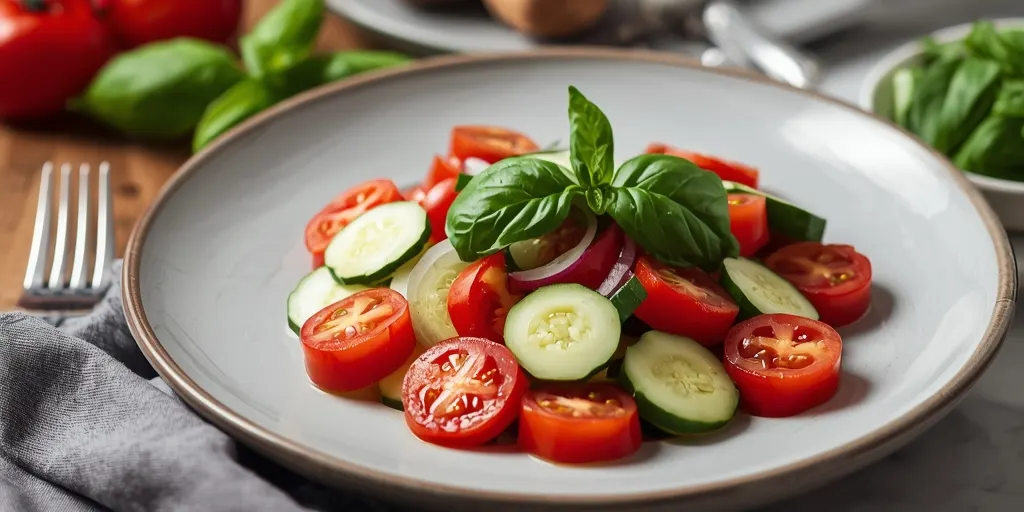 A refreshing and healthy salad combining crisp cucumbers, juicy tomatoes, and aromatic basil. Perfect for summer gatherings or as a healthy side dish.