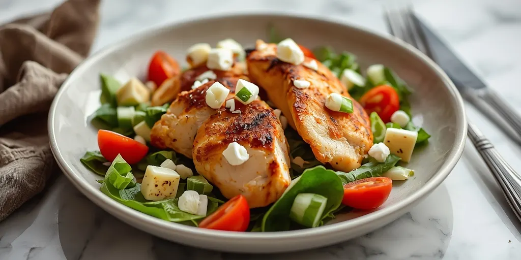 Pro Tips: Marinate the chicken overnight for deeper flavor. Ingredient Substitutions: Use chicken thighs for a juicier option. How to Serve: Pair with a side of hummus and warm pita. Storage & Freshness: Consume leftovers within 2-3 days for best taste. Make-Ahead Tips: Prepare salad ingredients in advance and assemble before serving.