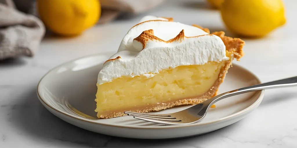 A delicious lemon custard meringue pie with a smooth filling, perfect for any dessert lover.