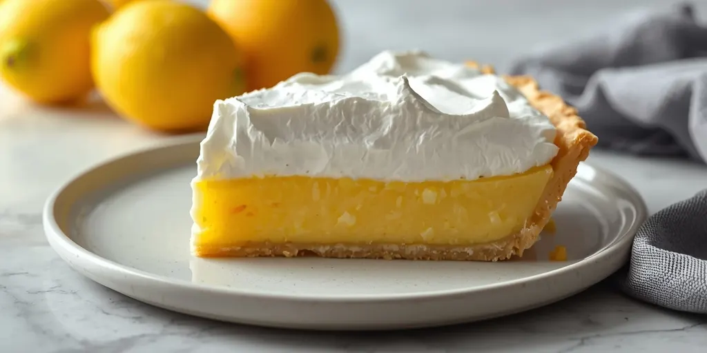 A delicious lemon meringue pie with a creamy lemon curd filling and fluffy meringue topping, perfect for dessert lovers.