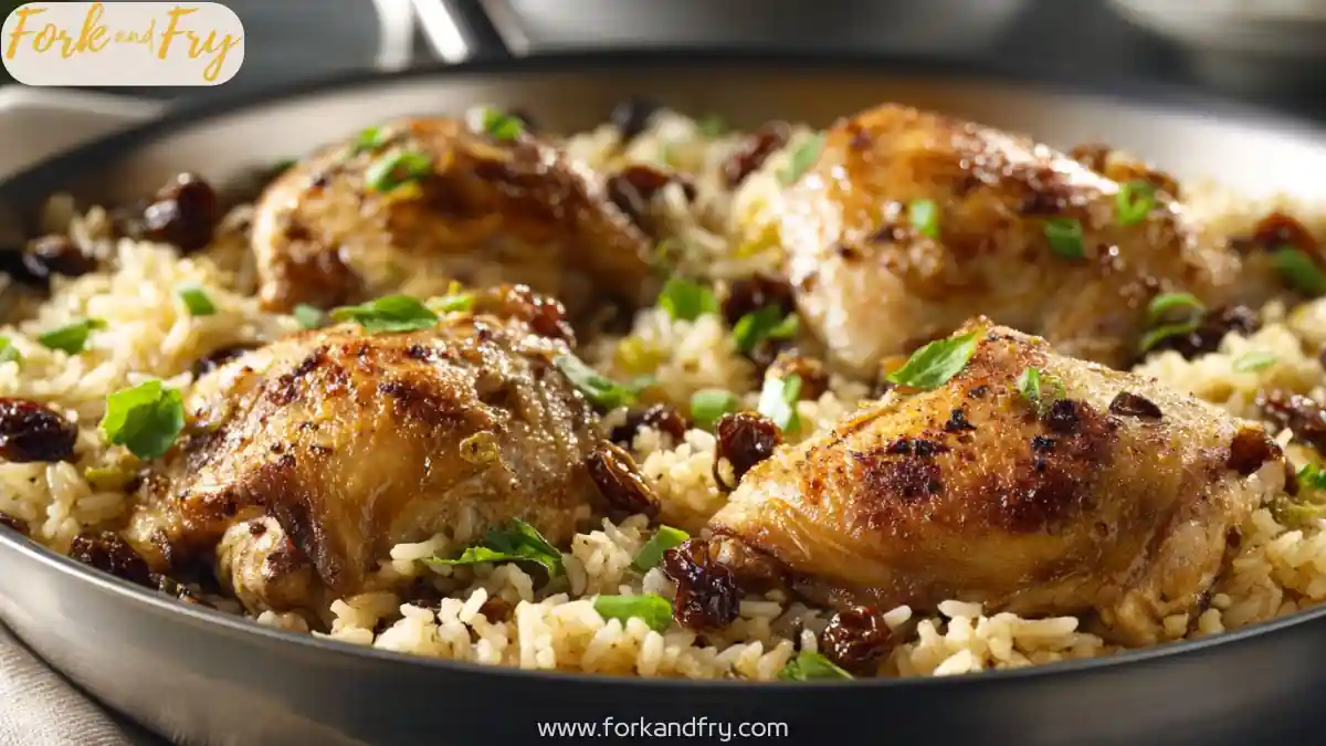 One-pot chicken and rice cooked with warm spices and raisins for a balanced, aromatic dinner inspired by North African flavors.