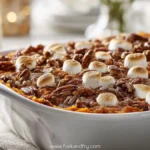 A creamy sweet potato casserole topped with gooey marshmallows and buttery pecan crunch, ideal for cozy gatherings.