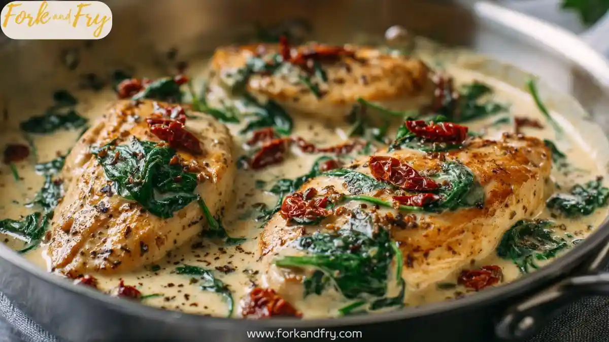 A creamy one-pan chicken dinner made with tender chicken breasts, spinach, and sun-dried tomatoes in a garlic-forward sauce.