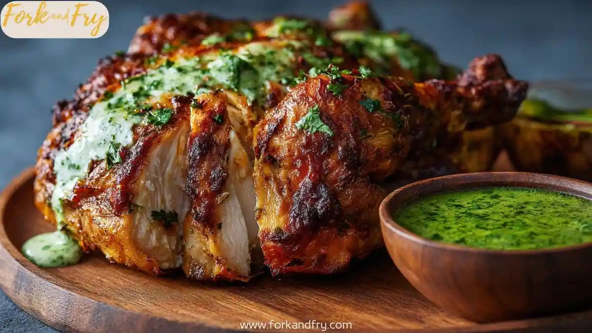 Oven roasted chicken marinated with spices and citrus, served with a fresh and creamy cilantro-based green sauce.