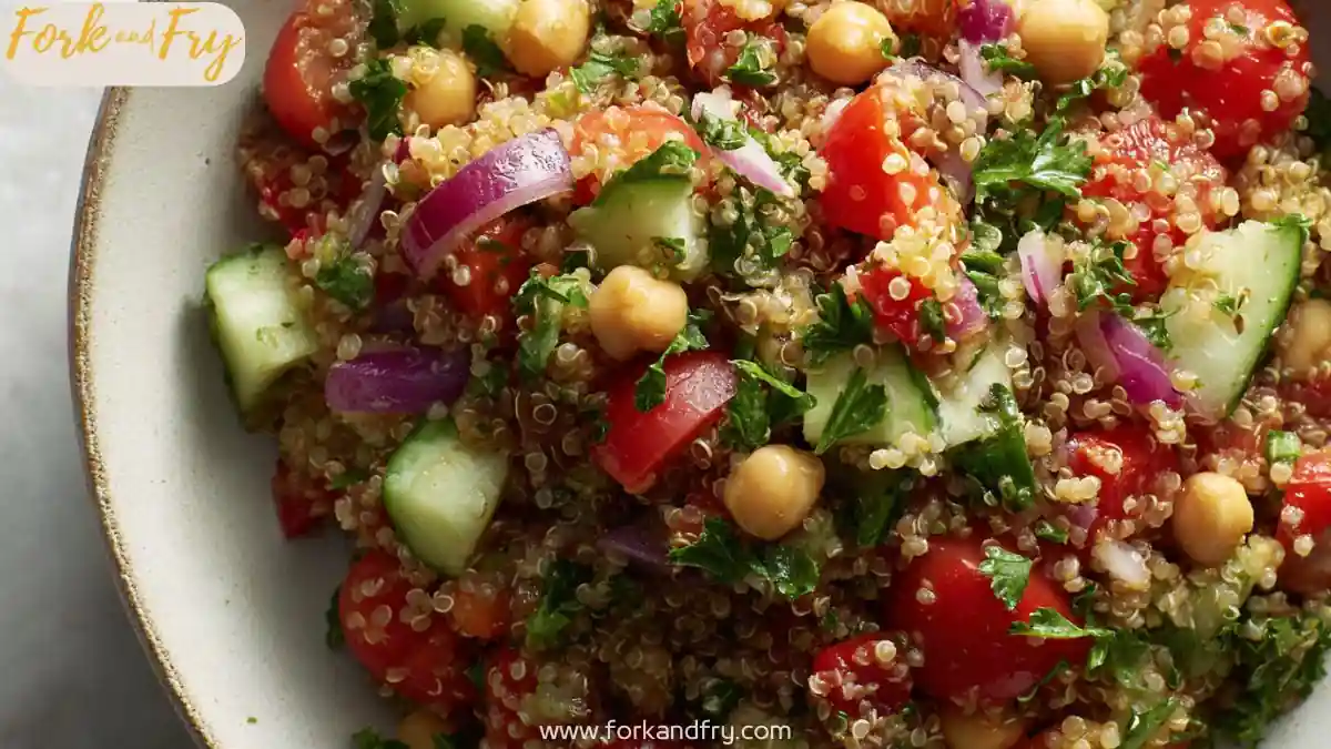 A vibrant and nutritious quinoa salad packed with fresh vegetables, chickpeas, and tossed in a light dressing, perfect for meal prep or a quick healthy snack.