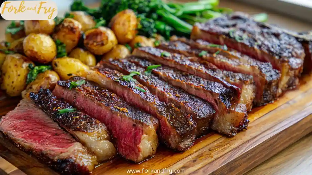 A large ribeye steak cooked whole, rested, and sliced against the grain for family-style serving. Designed to feed multiple people with consistent doneness and simple preparation.